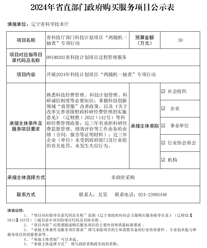 2024年省直部门政府购买服务项目公示表(澳门赌博平台部门科技计划项目“两随机一抽查”专项行动)