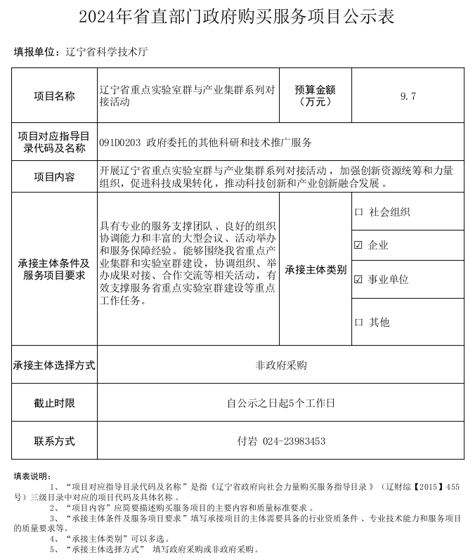 2024年省直部门政府购买服务项目公示表(辽宁省重点实验室群与产业集群系列对接活动)